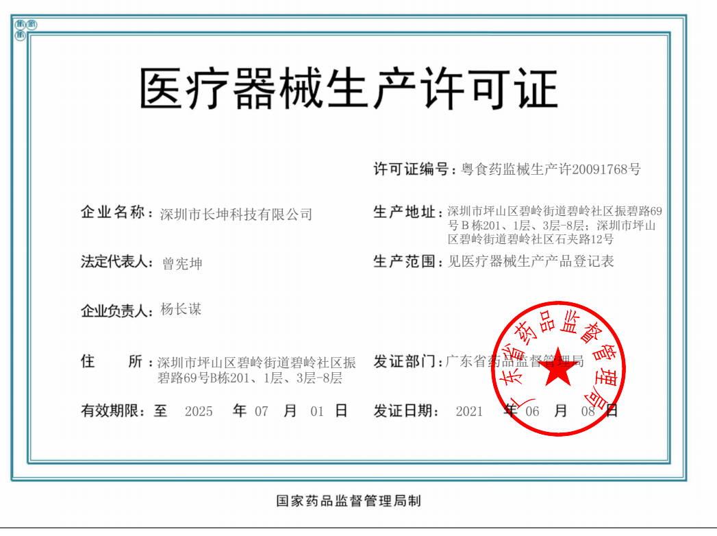 歡迎來到深圳市長坤科技有限公司官網(wǎng)! 粵深食藥監(jiān)械經(jīng)營備20151166號 粵食藥監(jiān)械生產(chǎn)許20091768號